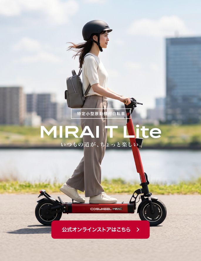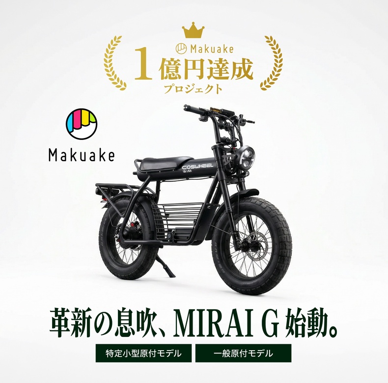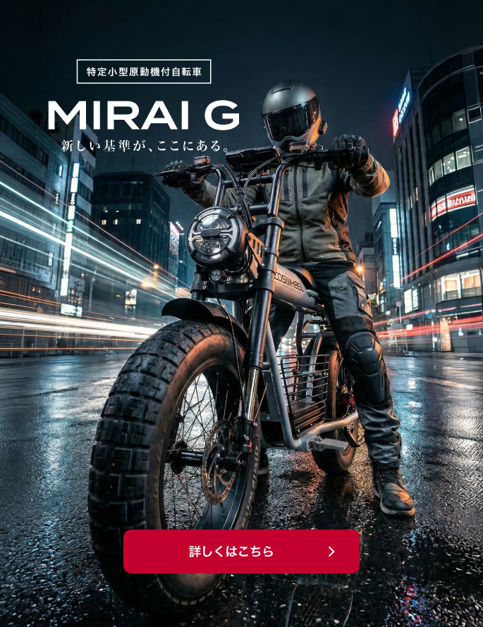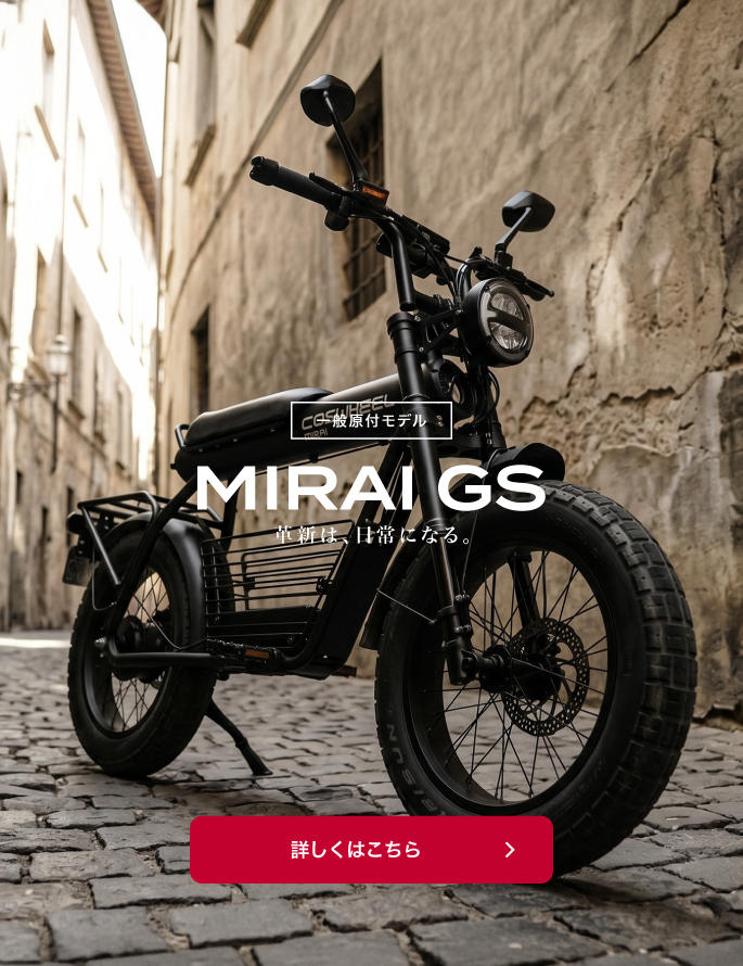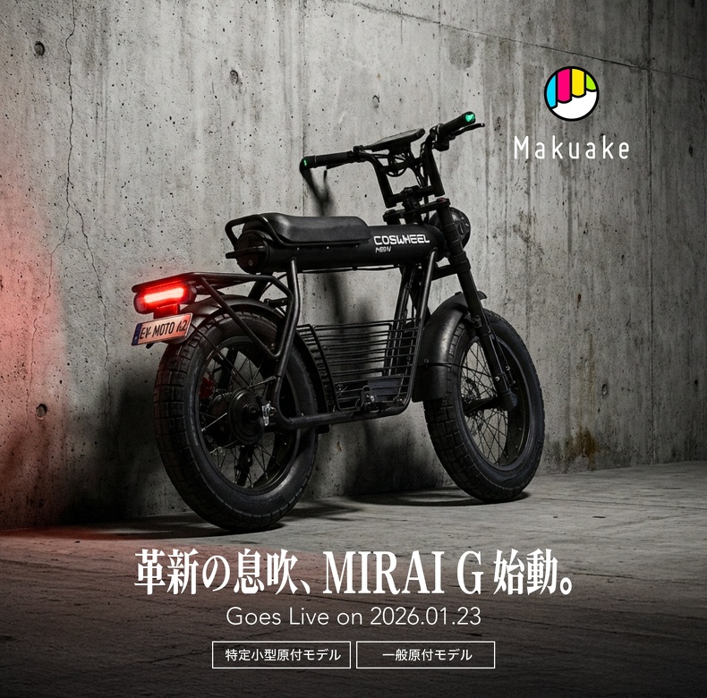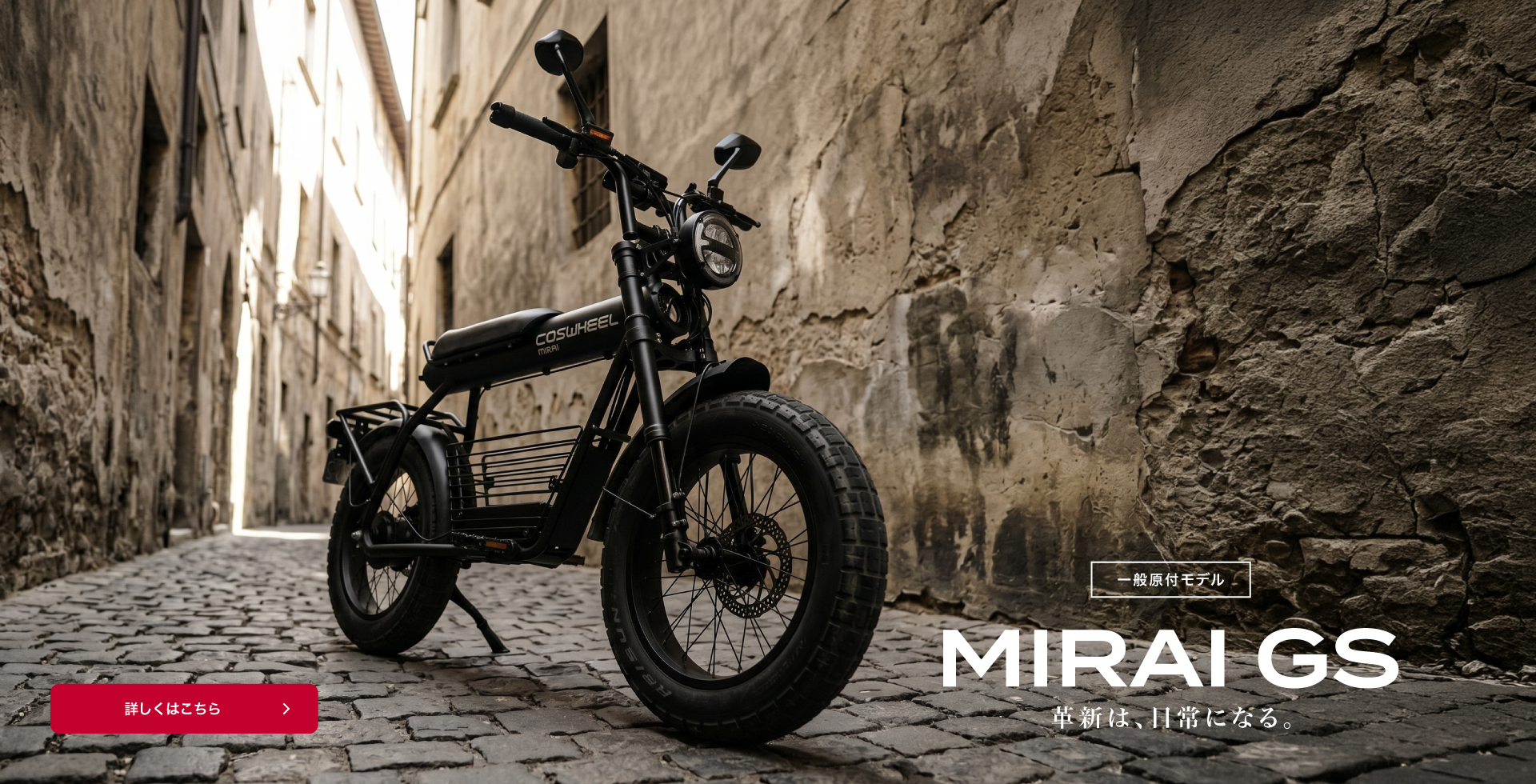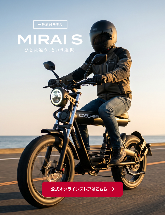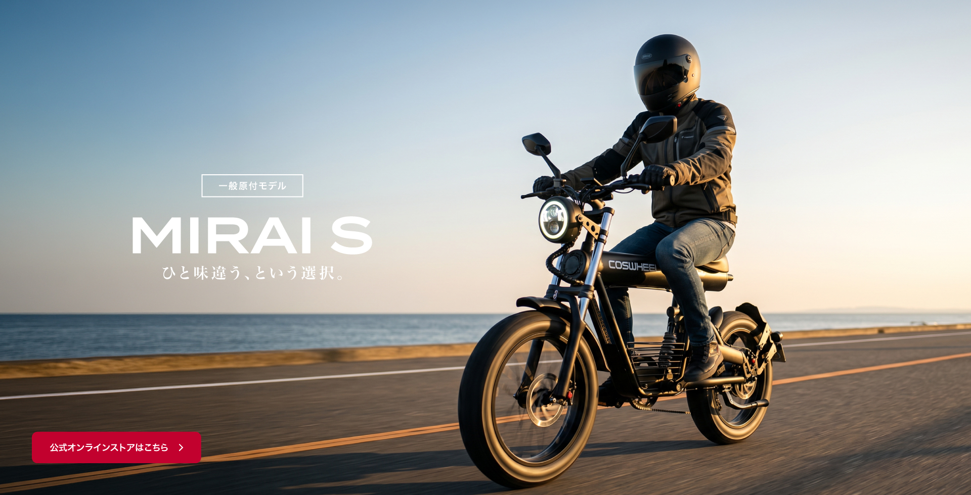 日本国内の電動バイクの歴史を塗り替えた1台がついにリモデル。走りの楽しさ3 種類!電動バイク・ハイブリッド・自転車。“COSWHEEL MIRAI” はバイクとしての利用に限らず、ペダルを活用することで3way での使用が可能に。