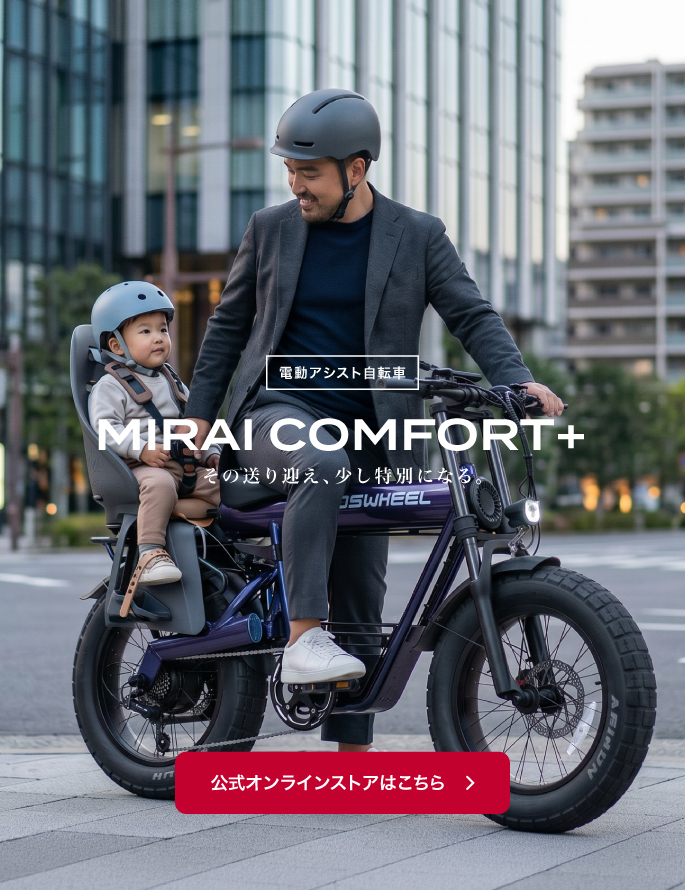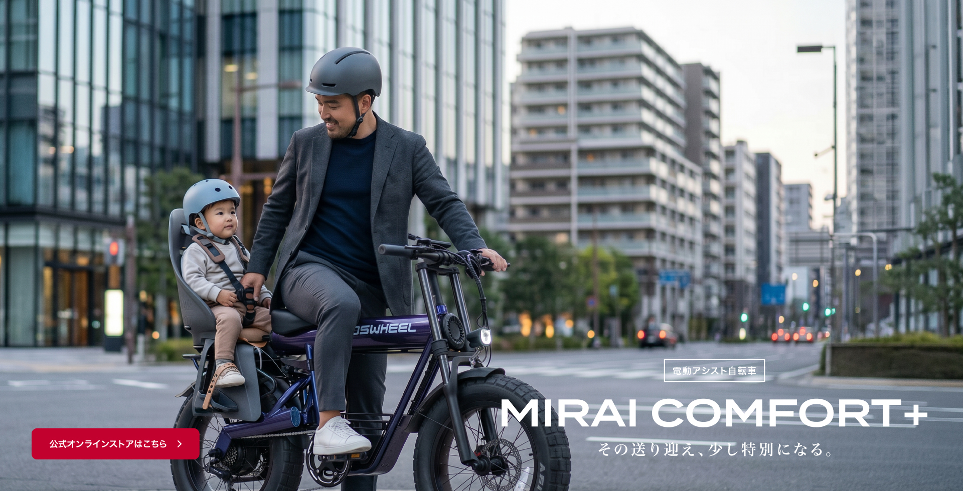 MIRAI COMFORT NEW MODELがついに登場。自由と洗練さを纏い、 遮るもののない純粋なライディングプレジャーがあなたのものに。 ダイナミックなライン。シンプルでクリーンなスタイル。だれもが楽し める電動自転車としての選択肢はこれ以外に無い。