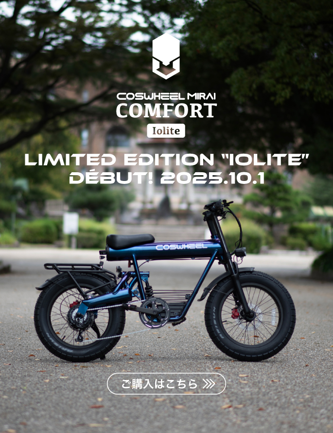 日本国内の電動バイクの歴史を塗り替えた1台がついにリモデル。走りの楽しさ3 種類!電動バイク・ハイブリッド・自転車。“COSWHEEL MIRAI” はバイクとしての利用に限らず、ペダルを活用することで3way での使用が可能に。