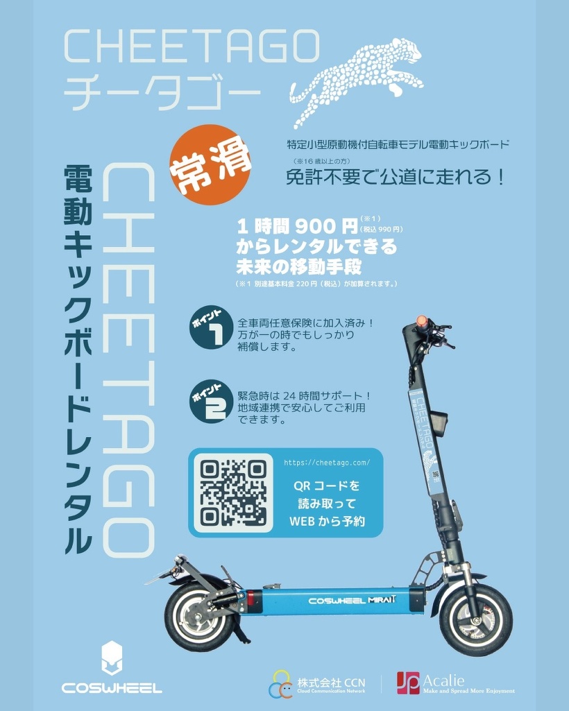 2023年10月2日より株式会社CCN(常滑・知多地域代表代理店)と株式会社Acalieは、関係機関の協力を得て、新法規に適用した特定小型原動機付自転車(電動キックボード)を使用し、常滑地域における電動キックボードレンタルサービス(サービス名:CHEETAGO(チータゴー))をスタートいたしました。