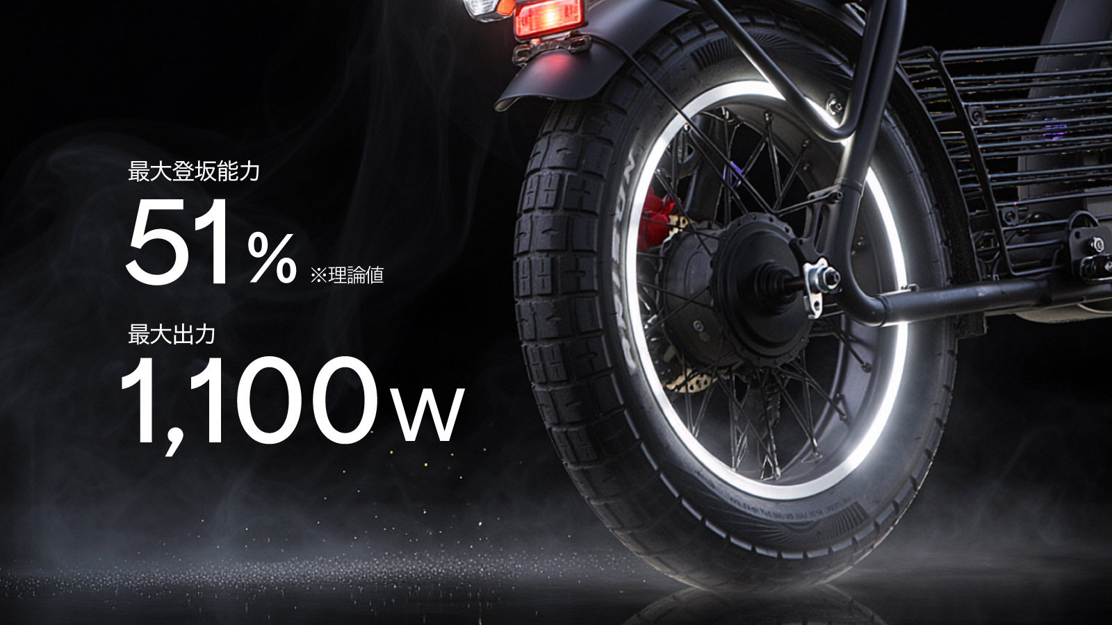 ・最大航続距離:約60km(オプション30Ahの場合120km) ※特定小型原付モデルの理論値です。