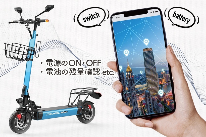 電源のオンオフや、バッテリー残量・走行可能距離・防犯機能など、“COSWHEEL MIRAI T”専用のアプリを搭載。※アプリの仕様は開発中です。