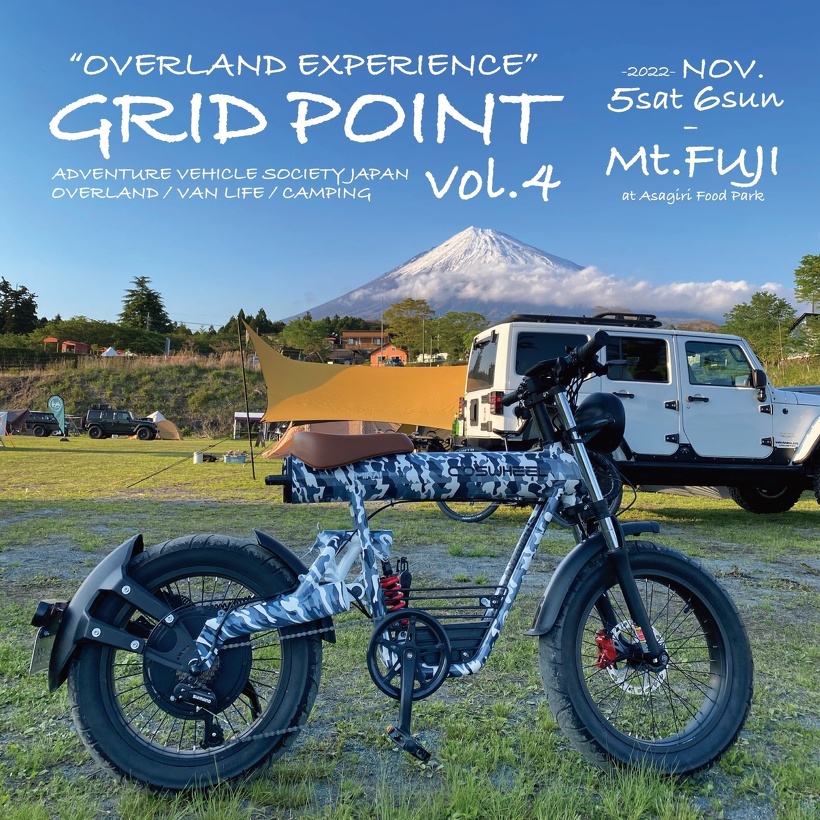 車とアウトドアの祭典 GRIDPOINT vol.4開催! 富士山の麓にて車とアウトドアの祭典 GRIDPOINT vol.4が11月5~6日に開催されます。完全招待制のイベントです。 COSWHEEL公式販売代理店の16BASEにてMIRAIシリーズ展示、試乗も。GRIDPOINTにご参加のお客様はぜひ、最新型電動バイクCOSWHEEL MIRAIをご体験下さいませ。お気軽にお立ち寄り下さい。
