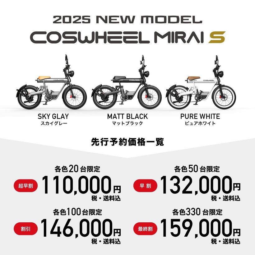 販売台数累計5,000台超7.5億円のBIGプロジェクトへ、COSWHEEL MIRAI電動バイク・電動アシストNewモデル2機種を2025年1月10日(金)12時より先行予約販売を同時スタート