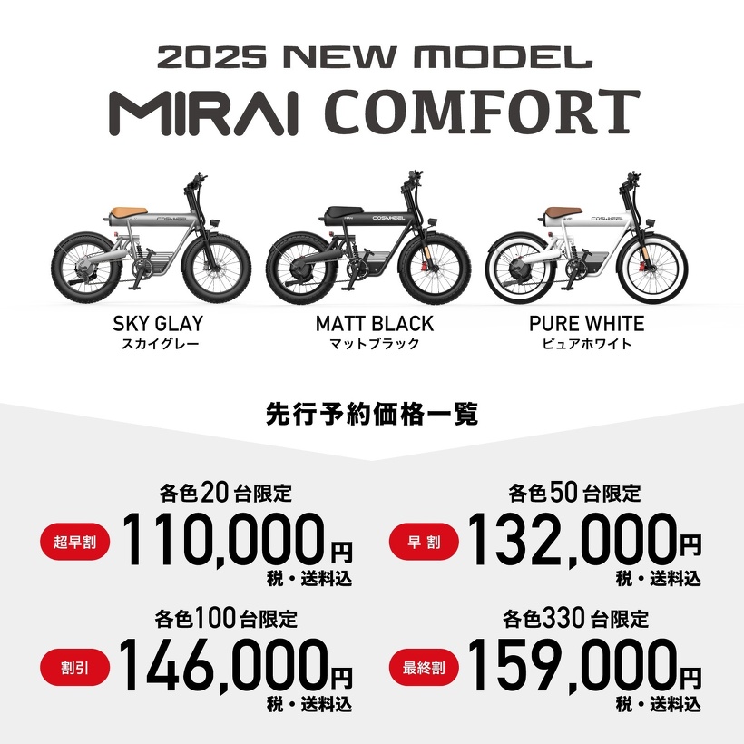 ※MIRAI S(電動バイク)/MIRAI COMFORT(電動アシスト)同価格でスタート