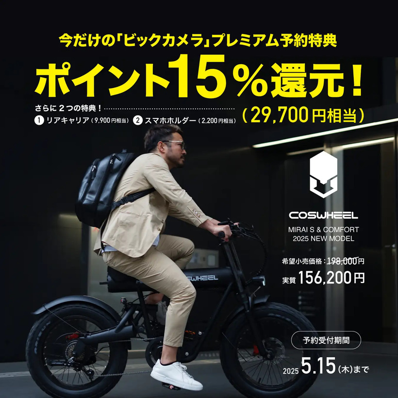 2025年5月15日(木)までの期間限定で、インターネット総合通販サイト「ビックカメラ・ドットコム」・および各店舗にてCOSWHEEL MIRAI シリーズをご注文いただくとプレミアム予約特典としてビックポイント15%還元、リアキャリア・スマホホルダーをプレゼントいたします。※お届けは5月下旬頃を予定