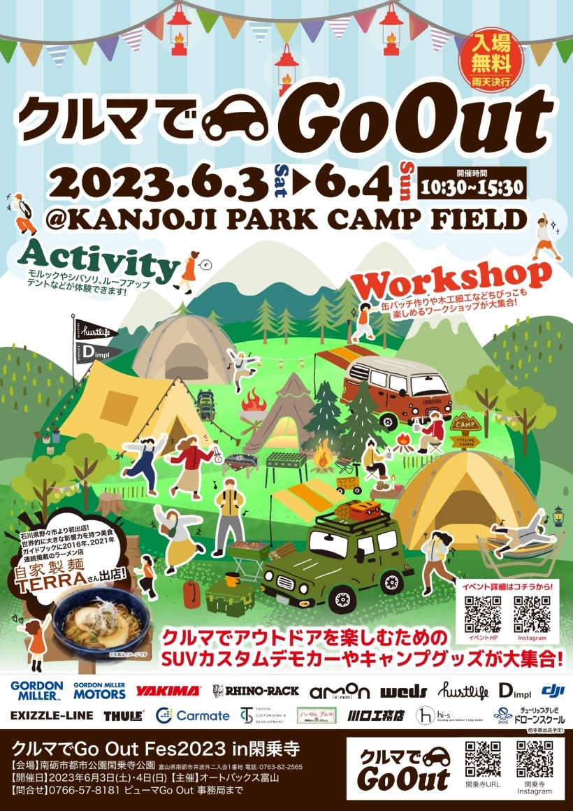 6月3日・4日に富山県の南砺市都市公園閑乗寺公園にて開催される「クルマでGo Out Fes2023 in 閑乗寺」に出展いたします。入場無料、家族で楽しめるアウトドアライフを楽しむイベントとなっております。皆様お誘いの上ぜひお越しくださいませ。