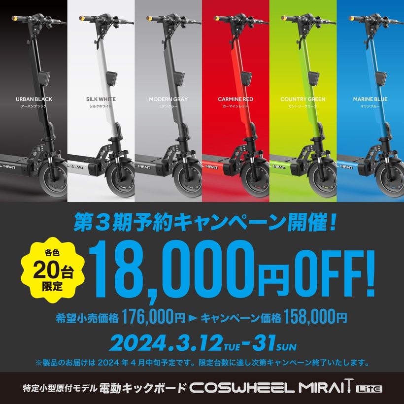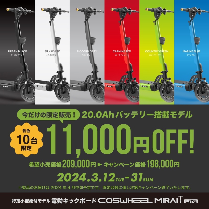 遊びではない実用的な移動手段として好評を博している特定小型原付モデルの電動キックボード「COSWHEEL MIRAI T Lite」は、おかげさまで第2期入荷分まで完売いたしました。このたび「第3期予約キャンペーン」と題しまして、定価176,000円の10%OFFにて各色20台限定で予約受付を開始いたしました。さらに、お客様より多くご要望いただいておりました20.0Ahバッテリー搭載モデルも期間と台数限定でご用意しました。キャンペーンは2024年3月31日までを予定しておりますが限定台数に達し次第、終了いたしますのでお早めにご検討下さいませ。
