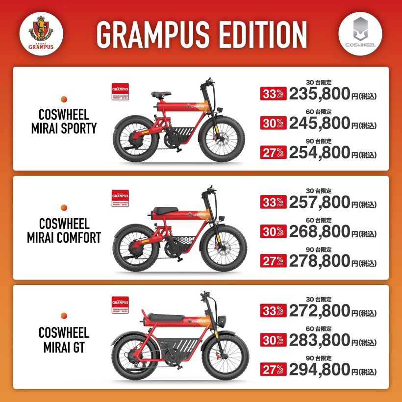 電動アシスト自転車 COSWHEEL MIRAI E-BIKE「GRAMPUS EDITION」3機種、Makuakeにて先行応援販中です。