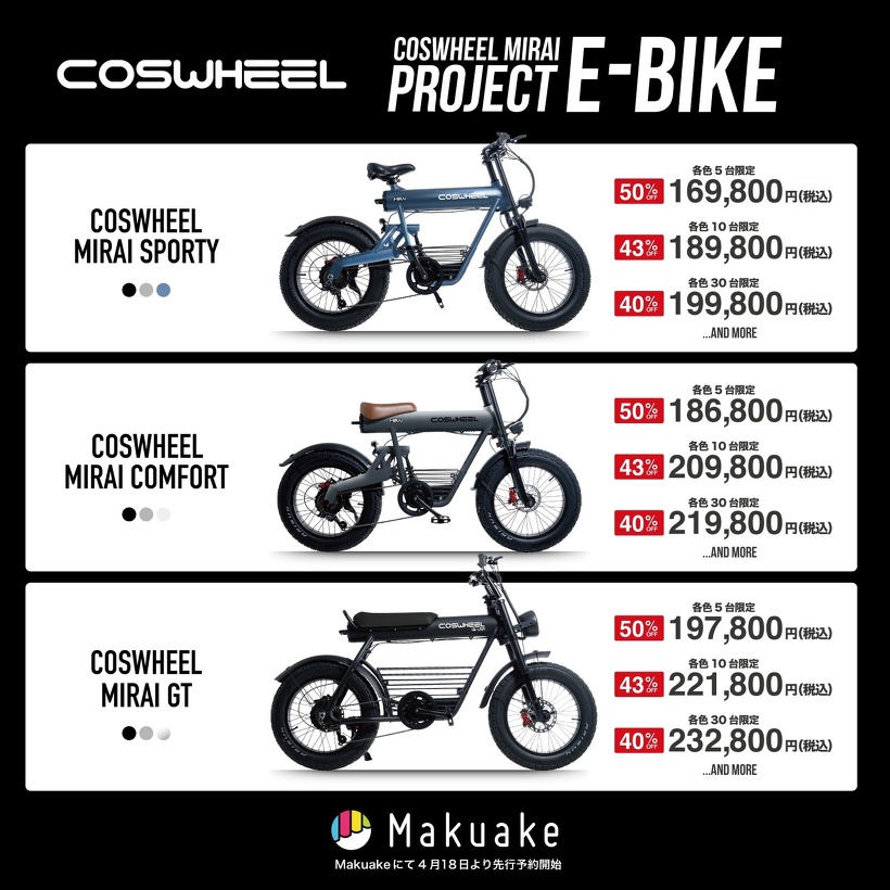 「電動アシスト自転車 COSWHEEL MIRAI E-BIKEシリーズ」を、応援購入サービス“Makuake”にて2023年4月18日より3機種同時に先行応援販売を開始いたしました。開始3日で応援購入総額は1,800万円以上、サポーター様は120名超える事ができました。皆様のあたたかい応援のおかげでございます。誠にありがとうございます。このMakuakeプロジェクトは2023年7月12日までとなっております。今後とも皆様のご支援、そして拡散のご協力を頂けますようお願い申し上げます。