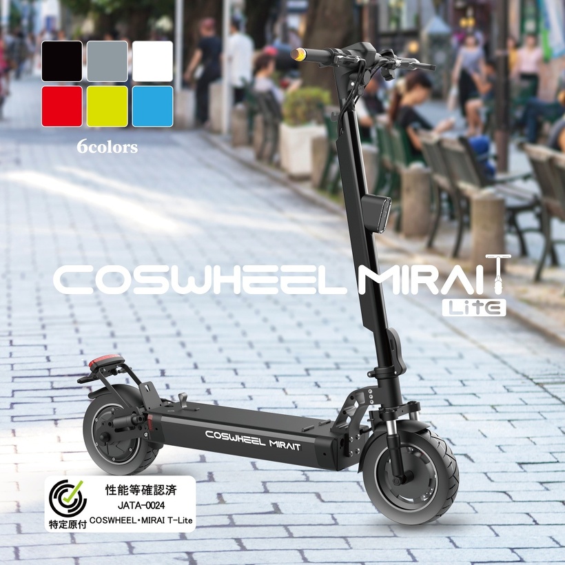 COSWHEEL MIRAI T Liteは免許不要、16歳以上で車道・歩道の走行が可能な “特定小型原付自転車” モデルの電動キックボードです。実用的な移動手段として開発した本機は立って乗る、座って乗る、カゴをつける、キャリアをつけるなど使用目的に合わせたカスタマイズが可能。バッテリーは脱着可能で、オプションで大容量バッテリーもご用意しております。